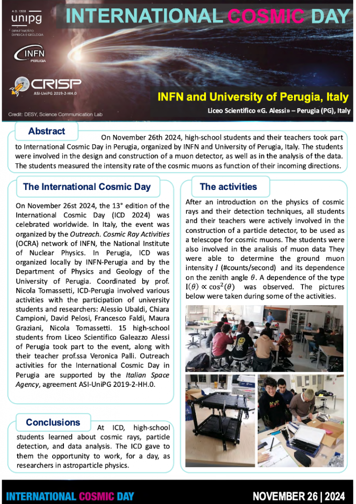 Il booklet contiene i contributi di tutti gli istituti scolastici partecipanti all’ultima edizione del Cosmic Day, tenutasi il 21 Novembre 2023, ed in particolare includerà il contributo del Liceo Scientifico G. Alessi e del Liceo Classico Musicale Mariotti di Perugia. Gli studenti e e studentesse di queste scuole hanno partecipato all’iniziativa assieme ai loro docenti ed un un gruppo di ricercatori del Dipartimento di Fisica e Geologia e dell’Università di Perugia della della Sezione locale dell’INFN.